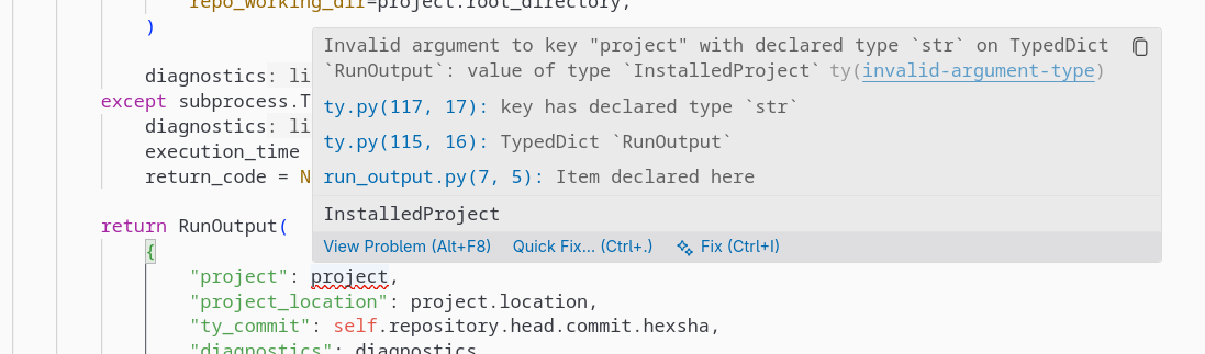 ty reports type errors and other diagnostics directly in your editor. Diagnostics